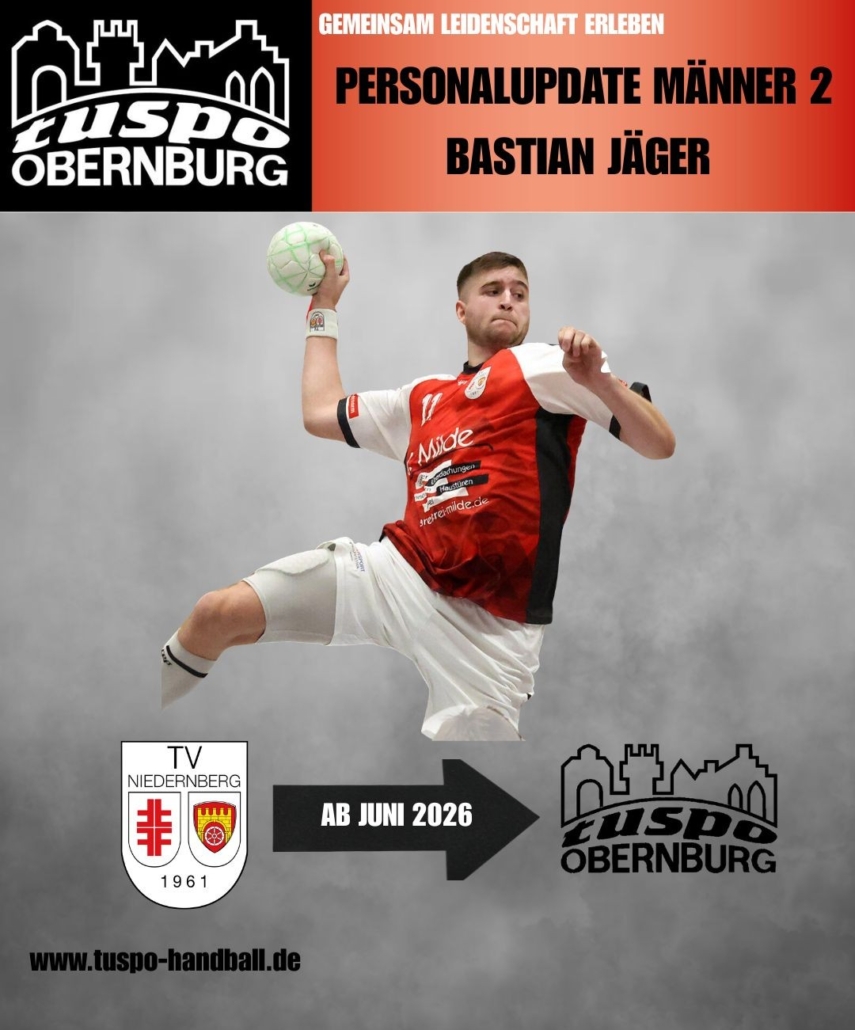 Der 25jährige Rückraum-Allrounder Bastian Jäger wechselt im Sommer 2026 vom Bezirksoberligisten TV Niedernberg zu den Tuspo-Männern 2 in die Oberliga.