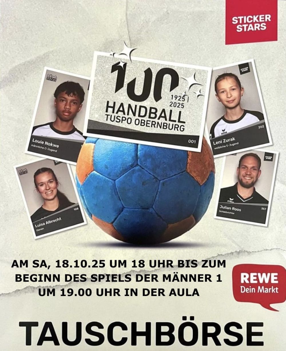 2. Sticker-Tauschbörse am Samstag, 18.10.2025 um 18 UhrAllgemein, News8. Oktober 2025 https://www.tuspo-handball.de/wp-content/uploads/2025/10/2.Tauschboerse.jpg 1225 1000 Klaus Zengel https://tuspo-handball.de/wp-content/uploads/2024/07/header-logo-300x138.png Klaus Zengel2025-10-08 15:38:142025-10-08 15:38:152. Sticker-Tauschbörse am Samstag, 18.10.2025 um 18 Uhr